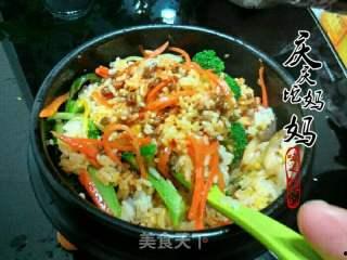 4. 拌饭:将胡萝卜、黄瓜、玉米粒等食材切成细丝,与炒好的牛肉混合在一起。